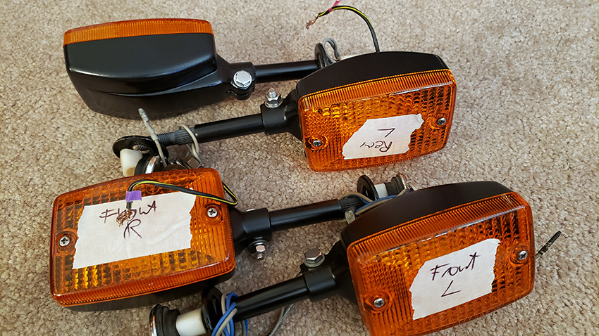 Another small update from last week. It took quite a bit of shuffling, but after laying out all the different parts for the turn signals I assembled a complete set. They didn't look this good of course! I had to clean and sand all the bodies, then painted them black. Made sure the electrical parts were right and moved freely, so more fiddling with connectors and wires. Then matching the stock bolts, as I don't have any stainless steel handy - it's all good. I like the stock look. All finished, and 100% stock. All wires including the bulbs correct, and the collars spotless chrome! Actually, some parts are brand new NOS Kawasaki. Great to have these crucial parts of the bike nice and ready. THey are actually looking better than those on my first bike!