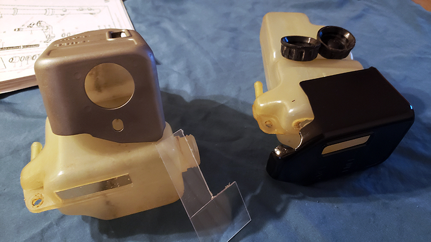 Working on two coolant tanks. Right - cover painted black and like new. Left - still just sand blasted and I think I will treat it for chrome plating. These cover are easy to switch, will be good to have one each for different looks.