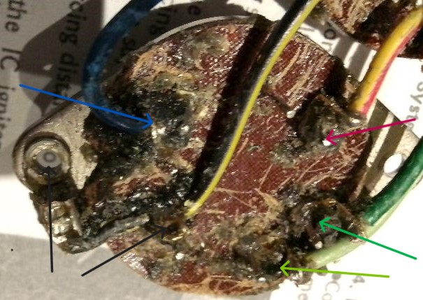 The green wire that powers the failed coil has loose and somewhat sulfurous solder.