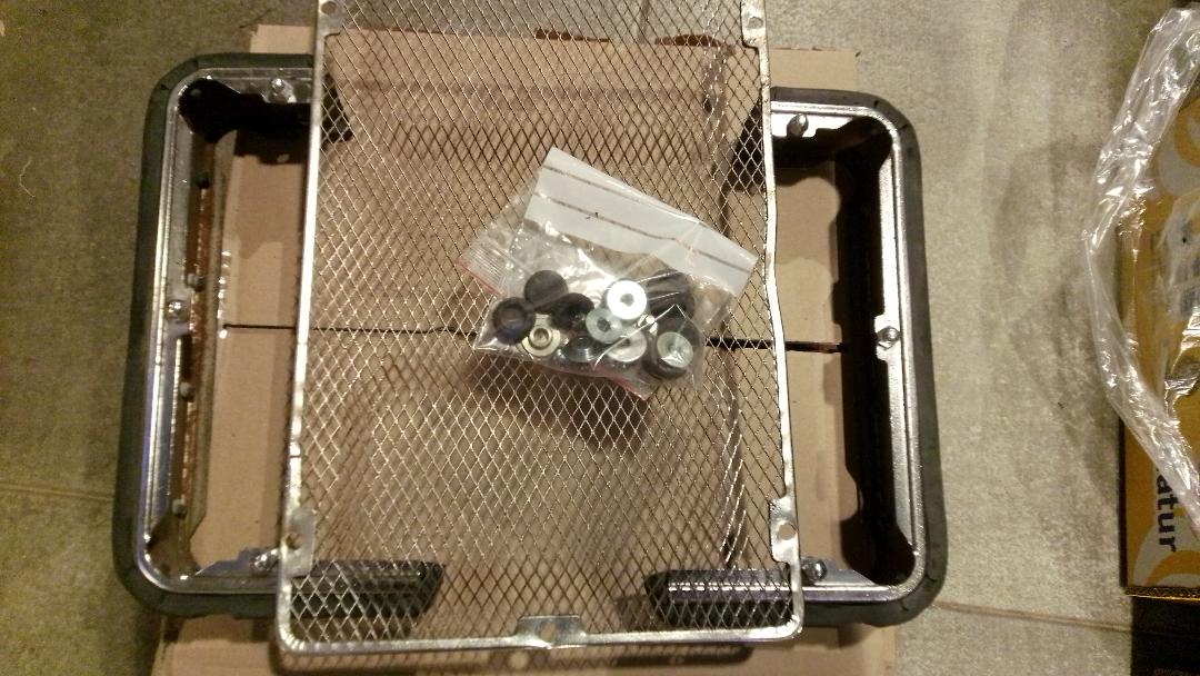 The complete radiator protector, with its grille, anchors, screws and corresponding rubber bands.