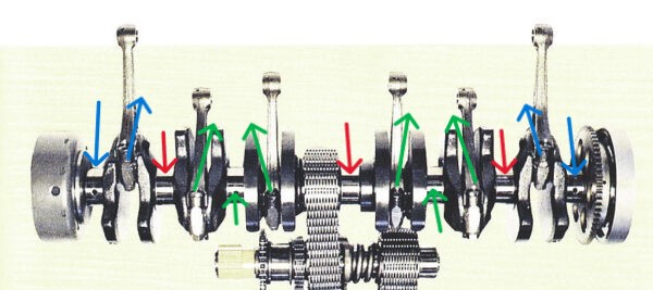 Main bearings 1 and 7 (blue arrow) feed connecting rod bearings 1-6.