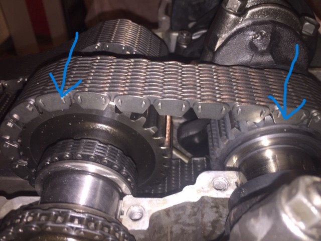 2 years 4 months ago - 2 years 4 months agoI counted seven links back from the mark on the output shaft and couldn't see the mark on the crankshaft.As for the timing mark on the crankshaft, I would suggest you get the secondary shaft in position and then count forward 7 full links and you should be able to see the mark on the crankshaft and confirm it. Then if necessary re-punch the mark or put a score line on the crankshaft so you know which tooth to use for alignment.