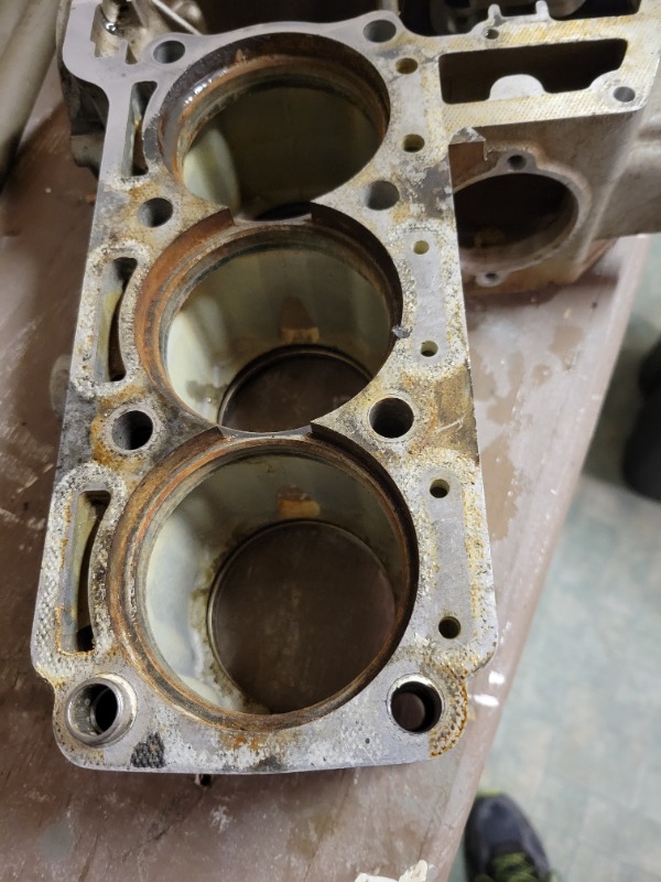 Bare cylinder block without liners. Note that on cylinders 1,2,3,4 the brown grunge indicating that the upper o ring had failed allowing coolant to leak in to the area around the cylinder sleeve upper flange, yet this engine was not torn down for a leak at the head gasket, so this confirms to me that if I were to go to custom sleeves, I could get away with no o rings at the top of the liner. This practice is similar to what happens when you install Darton Sleeves in most V8 engines.