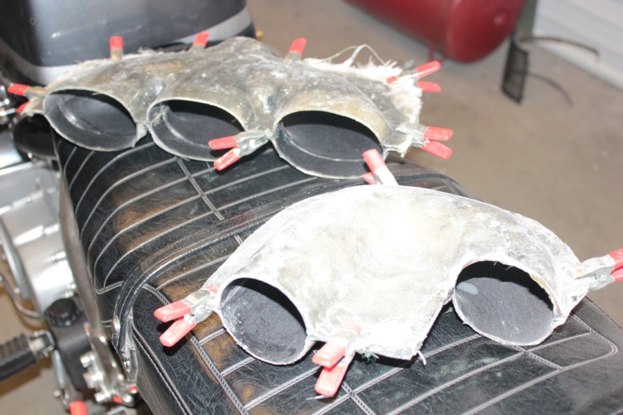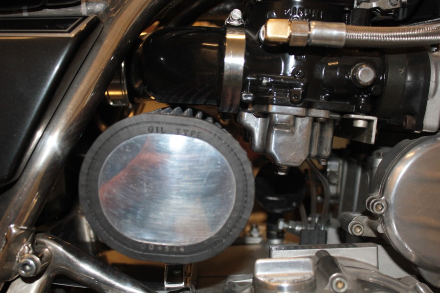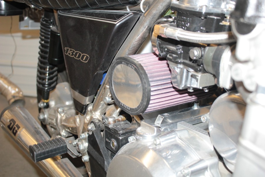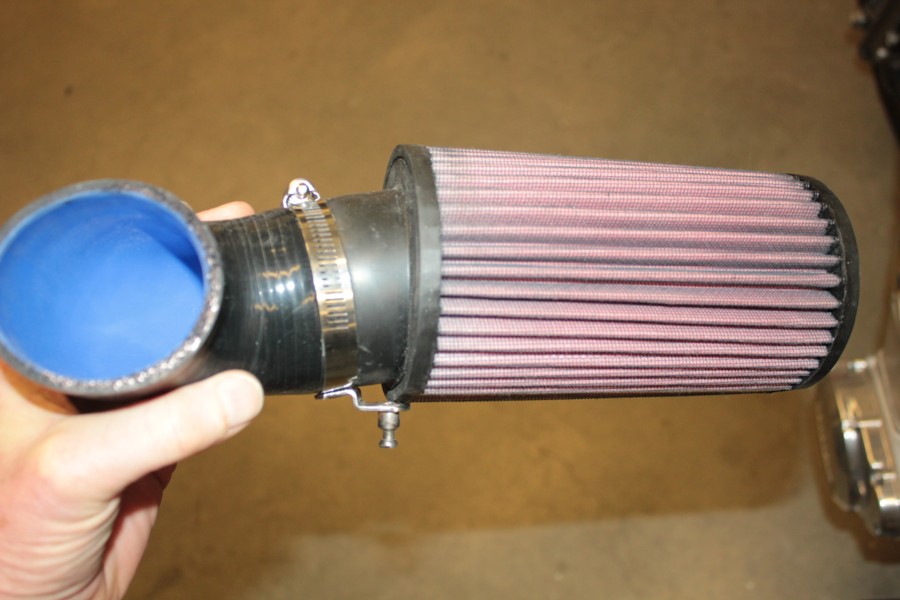 K&N with 2.5" fiber-glass intake tube and Plenum. Spent far too much time on this but the results are worth the effort. Started with foam plugs shaped to fit exactly, then laid up gel and glass cloth to produce the two, two-piece molds for each piece. The most difficult aspect now is cleaning the shop and bike. Fiber-glass dust is everywhere !