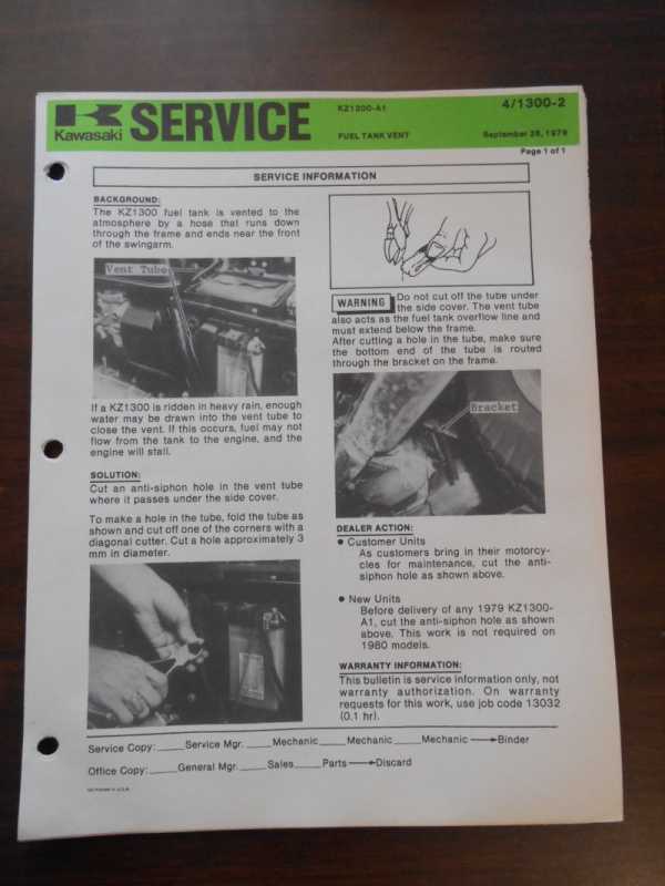 This service bulletin must have come out before Kawasaki introduced the breather tube fitting which looks like a fuel filter with no guts. Nice piece of history there Scotch. Where did you find the service bulletin?