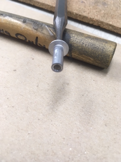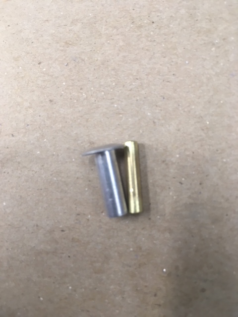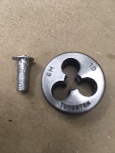 3/16" X 1/2" aluminum Pop-Rivet swedged with a 1/8" pin-punch with a piece of 1/8" brass tube pressed into it. A die is run-down the rivet to displace some material for a snug fit into the air-port. Not much more then scoring the rivet - Not looking for, nor want a full-thread depth !