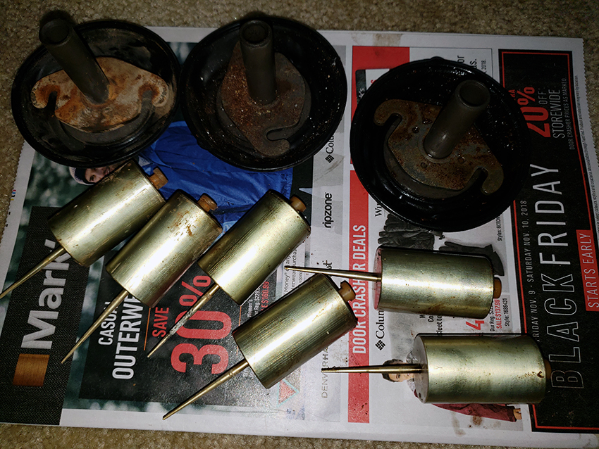 Another 5 minutes: just brushed off some of the crud and sprayed with carburetor cleaner to wash it off. It's not so bad. Actually, the worst looking one (on the right) looks the cleanest. It often happens that a piece of machinery covered with a thick layer of oily dirt grime is a good sign, from the perspective of preservation. It seals and protects from moisture, and deterioration.