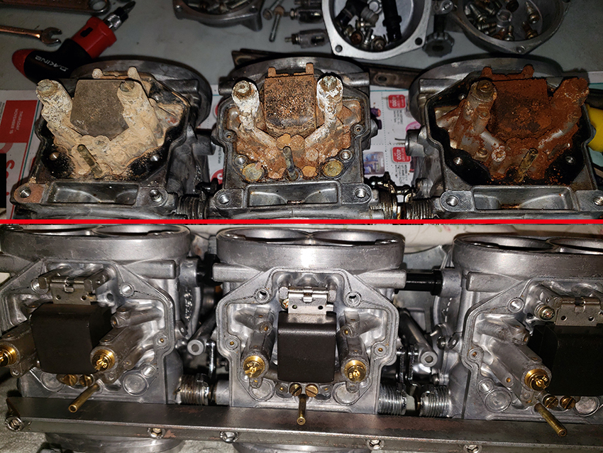 Got rid of what looked like limescale where emulation tubes go and fuel supply. Gross!!! Once those float valve bodies are off, you can really see that no amount of ultrasonic cleaning would take care of it. All compacted and stuck, including weird colors. For ultrasonic cleaning surfaces need to be exposed.