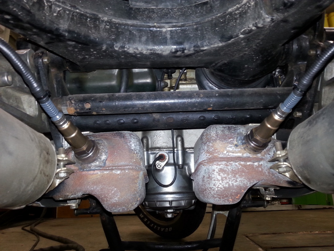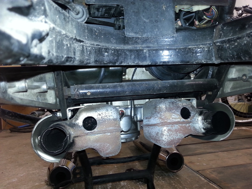 First step was organizing stuff and make a plan what goes where, build shielded cables, some small stuff etc. Decision where to put the bungs was crucial, I had to position theme in, so no water will accumulate in the sensor otherwise the porcelain inside will crack when they heat up, also they must maintain proper temperature with help from exhaust gases in order to work at all, so not too far from exhaust port, and third, it was going to be only two sensors, so one for the left and one for the right side where middle carburetor fuel level setting will be shared, also I was slowly running out of space. After that, welding the bungs on to the collector boxes and routing the cables. Worth mentioning is that when center stand is up it must not collide with the sensors, and I know there is very little margin to spare. Than the wiring of the connectors, building the housing for the controllers and display, voltage supply and finally building display electronics it self from scratch because of the price for dual display was waaaay to high !!! Oh well, one has to do it him self.