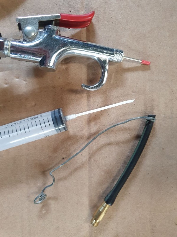 Owe you guys an update. Not sure the soaking for 20 minutes would do the job as I have squirted laquer in every few minutes for a couple of hours, then blasted with air. Rinse and repeat multiple times but no joy. Reference first photo below. The narrow plastic nozzle off a CRC can fitted nicely into the syringe and then tappered the other end to be flush with the idle passage exit in the emulsion tower. Used the football inflater attachment for the air compressor, a little electrical insulation on the tip to close off the side opening and fitted pretty snug against the idle fuel passage opening. This worked, eventually, on one blocked passage on #1 carb but wasn't making any progress on the second blocked passage on #2 carb. Then the repeated advice of wiser men kept echoing in my mind - flush in opposite direction of flow. So pondered on how to block off the bottom of the idle screw cavity. It ain't pretty (second photo) but got a small rubber plug (out of my hole punch for leather/rubber) that was a friction fit in the idle screw hole, tapped a small flat headed brad through so I could get the plug out later, easd it carefully into the idle screw cavity with brad sticking out. Then placed air compressor with rubber hose attachment over the brad and held it over the idle screw opening. One puff and it blew clear. Afterwards I thought I should have put a dab of liquid insulator on the head of the brad, to avoid potential damage to the idle screw seat, will do that for next time. Super easy and should have done it from the getgo. Hope it helps someone else.