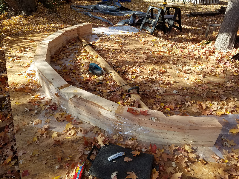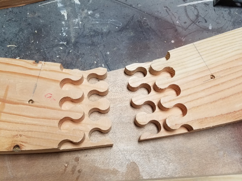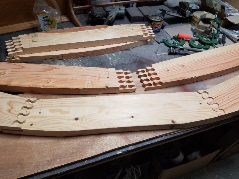 Until now I'd only used bulb joints to make picture frames and various cabinet / fixture types of projects. This fall I decided to venture out into the realm of structural applications by building an 11' by 16' shed that will have a barrel shaped roof. The picture above is of two 2" by 8" pieces of Douglas Fir that will join four other pieces to make one complete arched rafter.