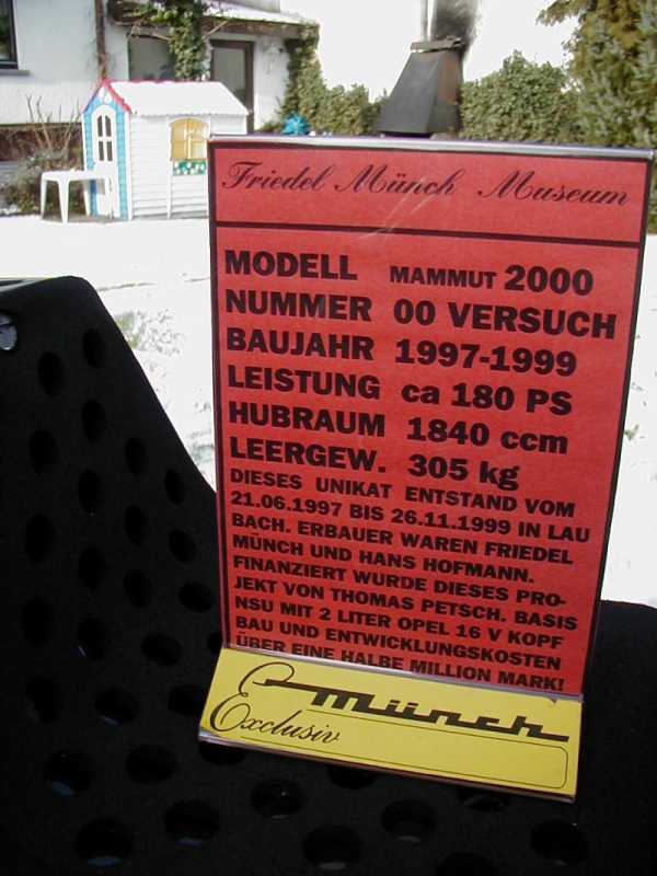 On one on our winter-rallies 2001 we used to visit a small museum and Friedl Munch himself was present. It was the time when he and a financier were about to develop the famous Munch 2000, originally planned to costs EUR 75000.- per piece and limited to just 250 pieces. In the end the just produced 9 and two out of spare parts due to costs reasons (no wonder), however I had the chance to see the first prototype -well, see yourselves.