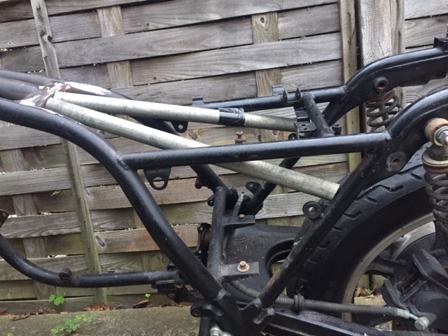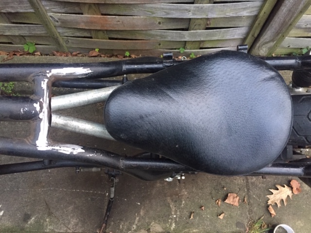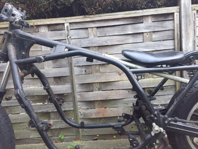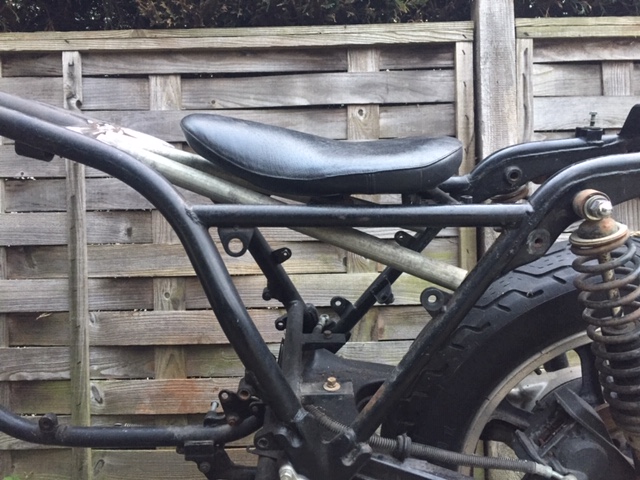 The horizontal braces will be cut away and the rear verticals will be linked together with a hoop behind the seat. The seat will sit on top of the two new cross sections. The seat height will then (for me) be perfect and same as my KZ1000P.