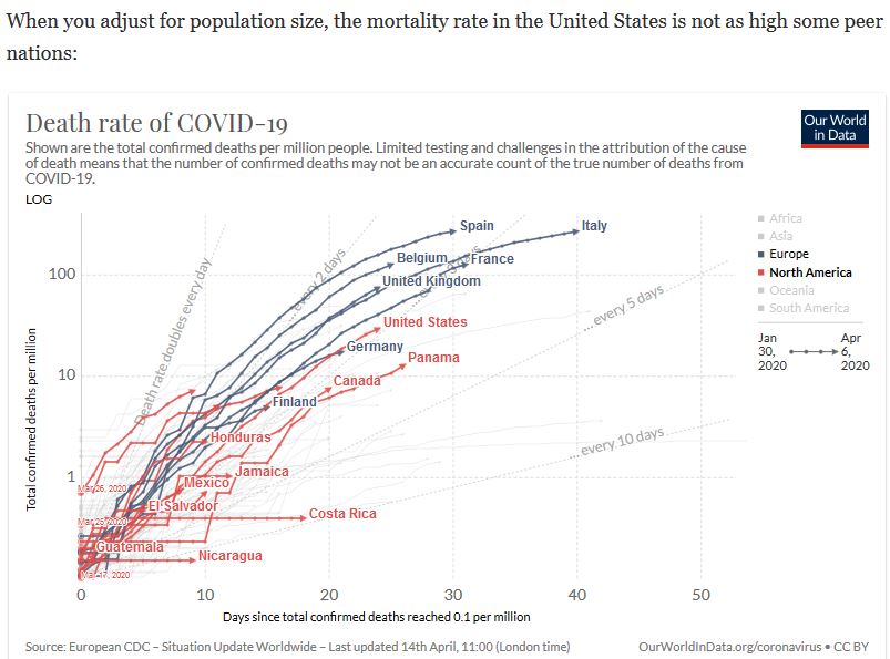 Regarding the Mortality chart: The numbers per capita are misleading. You must take into account that most of the countries on this chart have multiple borders and/or have economies that can't support "typical" basic health care, let alone deal with C19. These countries exposure from their neighbours and/or their inability to initiate protocols and manage their own outbreaks translates (in my opinion) to a far more serious situation in the US then the chart suggests. So when I look at the US mortality rates and consider it borders only on Canada (AND THAT"S MY CONCERN) and Mexico; the U.S.'s situation is critical and reflects directly to the political chaos, executive indecisiveness and Trumps absolute disdain for those states which are not republican. It's notable that Calif., Oregon and Washington (just to name one group) are now coordinating their own strategies due to the lack of any from the Capital.
