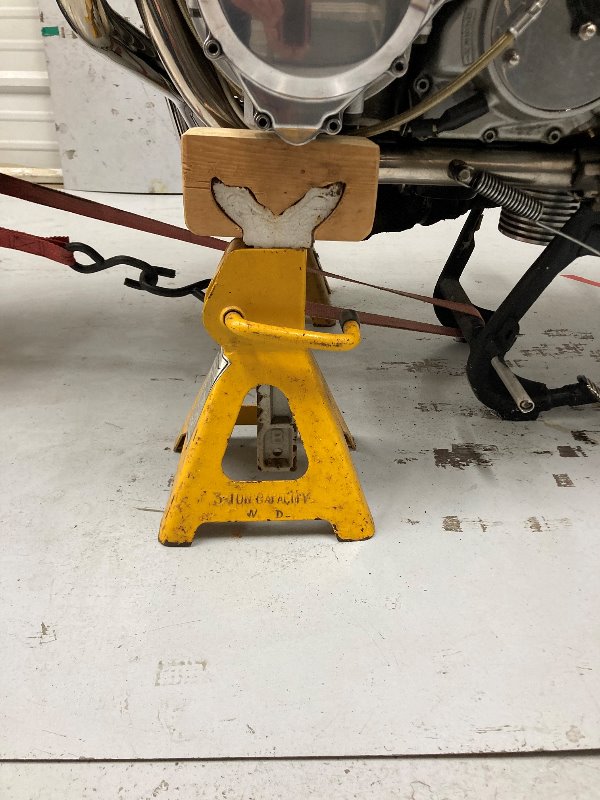 A piece of 4X4 between the centre-stand and the rear wheel works too !