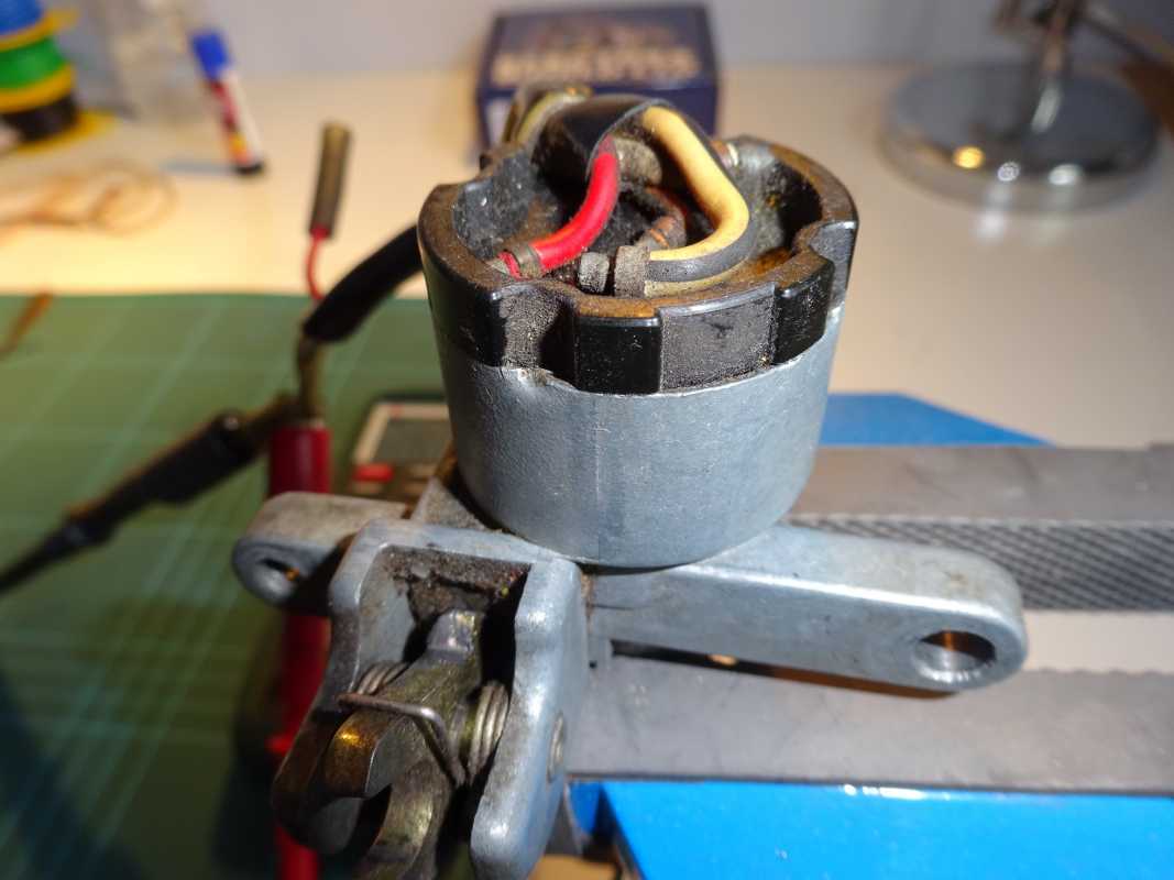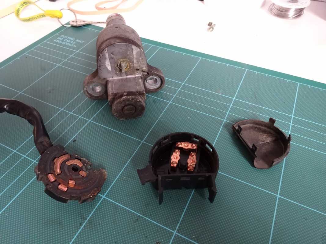 Ignition switch: First challenge is to prize this apart once you have removed it from the top steering yoke. The cover was relatively easy but I used a couple of small flat blade watchmaking screwdrivers inserted between the main housing and the main contact plate (centre and left respectively in picture below). After 37 years, the plastic housing can be brittle so this requires some care and patience! The deposits and wear on the main contact plate are fairly clear in the photo.