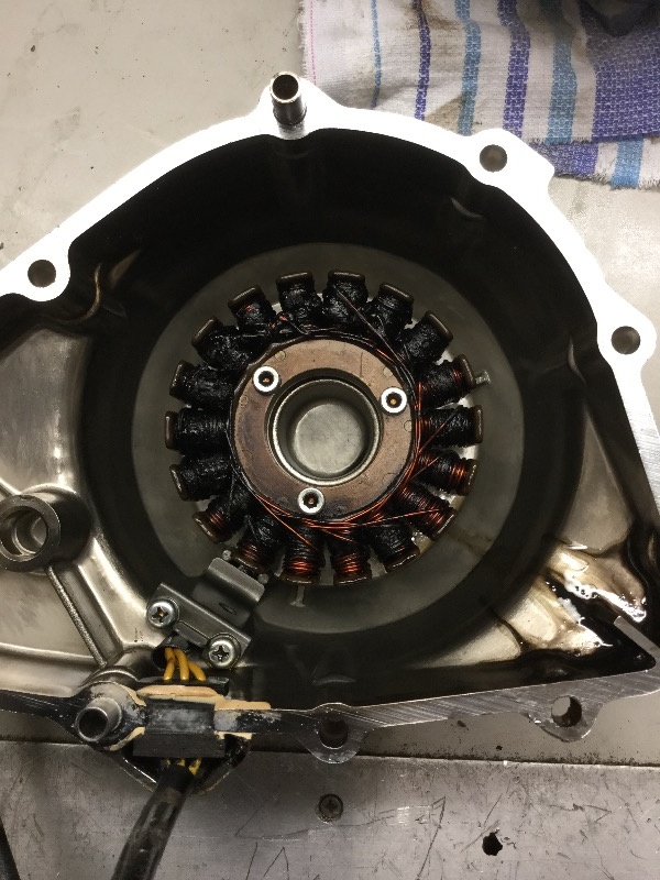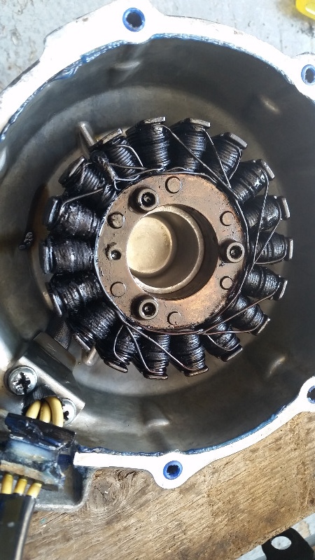 Looks like that stator is well cooked. I'd be shocked if it was still charging and if it is it won't be for long. A quick and dirty check for continuity between the windings and the casing will probably tell you for sure. With the continuity function on a multimeter, check place the probes on each of the three wire ends and see if there is continuity between any pair and/or the casing. If so it is most definitely fried. If not, I still wouldn't put it back in as its not long for the world.