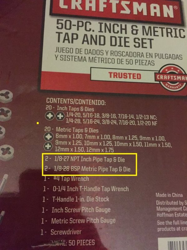 6 years 5 months agoYeah it's a pain in the ass to figure it out sometimes. And one will fit into the other but not the other way...scotch wrote: This topic found me "Googling" further and I learned something. I have always been under the impression that "Pipe Threads" were universal. Apparently this isn't the case as the following screen capture indicates. It probably explains why I initially had trouble getting a standard brass "tee" to easily thread into the block when I was configuring an oil pressure gauge. I eventually got the Male end to thread into the tapped port in the block. Alignment to start the threads was critical.