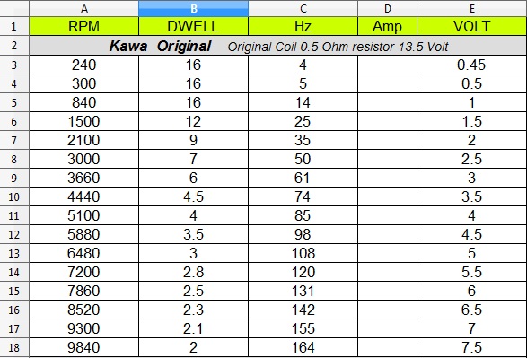 Kawboy column E Volts is for my own reference only. When testing it indicates the rpm simply by reading the voltage applied to the motor, bench psu have digital multi meter so its easy. First module i have tested and actually it was running in the bike was the Hella 5DA 006 623-051. I didn't know what to take so i when for it because of the manufacture name i know for many many years. Initial testing did not reveal the great weakness of this unit. So first it was a success because i have manage to build my own ignition and fitted to the bike, however the happiness didn't last for very long, after discovering that the bike have slight stumble up on quick throttle, or in stand still reeving up. This is how the "research" was born