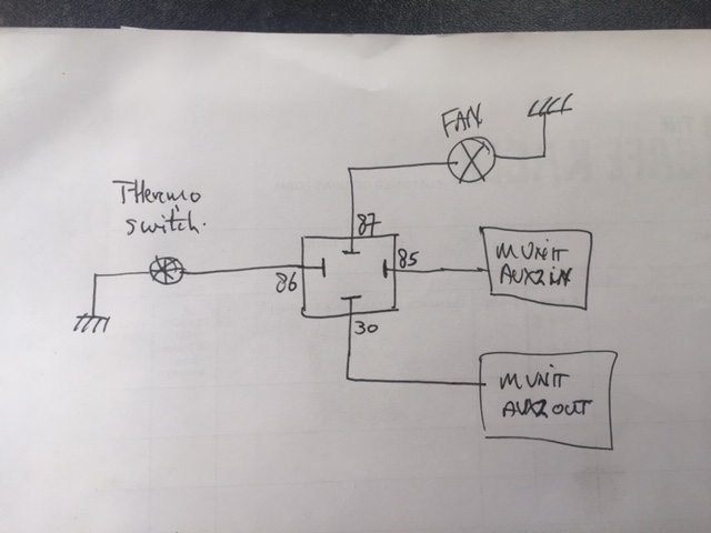 This is for the fan with the switch on the left and the solenoid in the middle. I will deal with the 1 minute delay factor when it is running as that acc to the manual can be programmed in to the M Unit Aux 2.