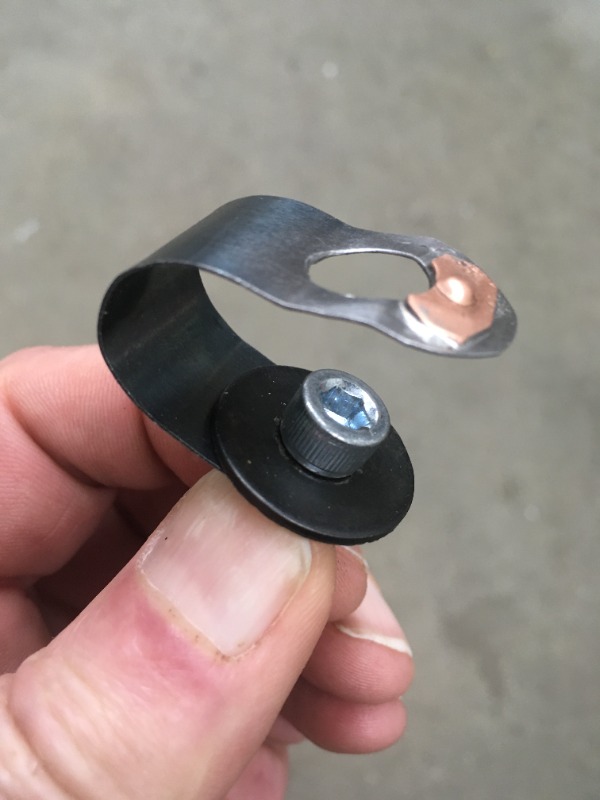 The 10mm "Pin Holder Bolt" needs to be replaced with an Allen head. Most switches have usable contacts inside. Something similar to the one in the photo can be soldered to the Steel-Banding. The large washer is necessary to reduce flexing of the spring-steel banding.