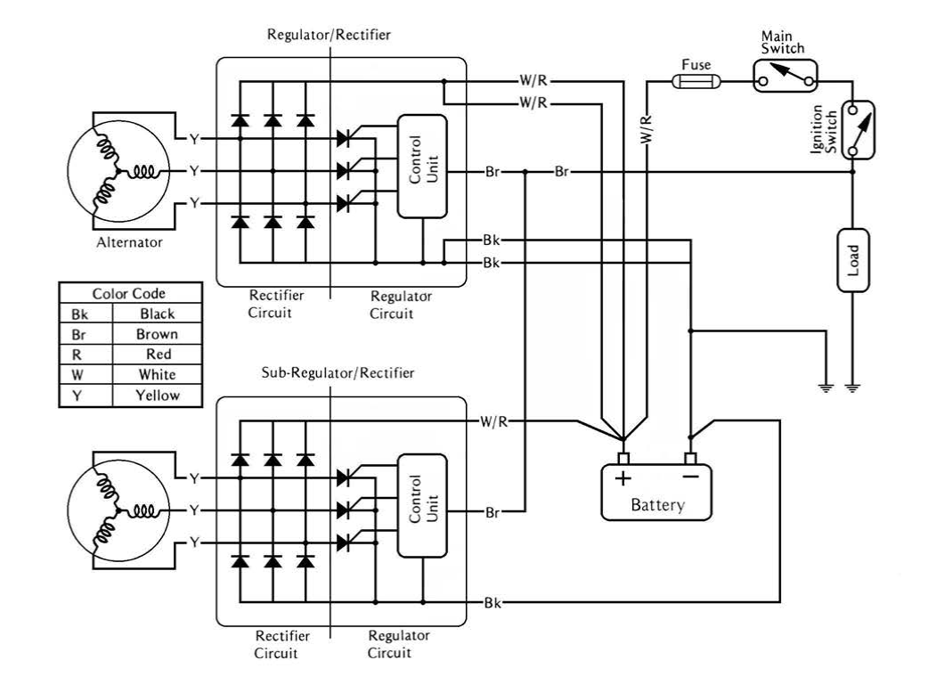 Note the Brown wire between the 2 "Control Units". This is quite different from the single charging circuit of the KZ1300's