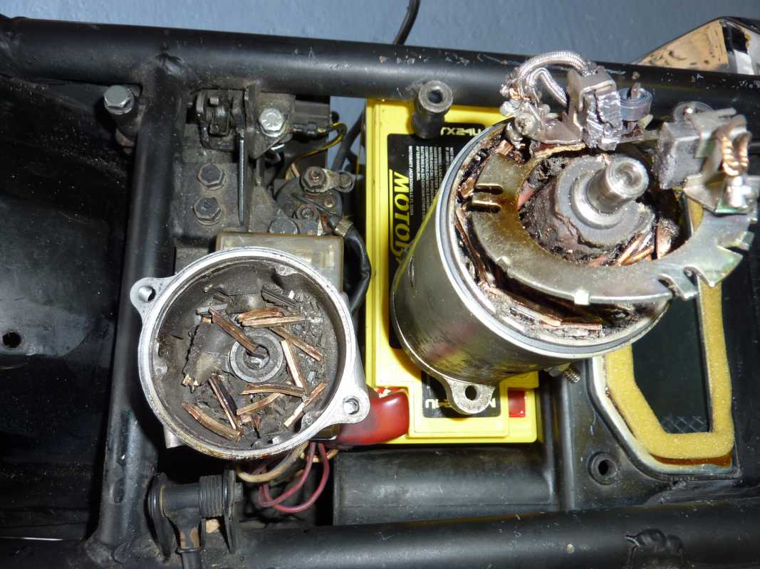 Getting the starter motor out is easy-peasy. Two bolts for the cover, two bolts for the motor, disconnect the hot wire into the starter motor (be sure to use a thin wrench to hold the inner nut- if the shaft turns while unscrewing the outer nut, you can break an internal connection and trash the starter mother right there), slide the motor back (to the right of the bike) and pull out.