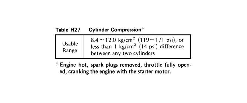 7 years 4 months agothe ideal compressionDaro wrote: Hi Kawboy, the spec is from the same table you posted, I converted (119~171 psi) to 8,2~11,7 bar and 14psi to 0,96 bar. Its still with in the usable range but I just thought 9 bar was rather on the low side, also the difference between two cylinder which in my case is almost 0,9 bar, its nothing dramatic thou, but still a slight concern.