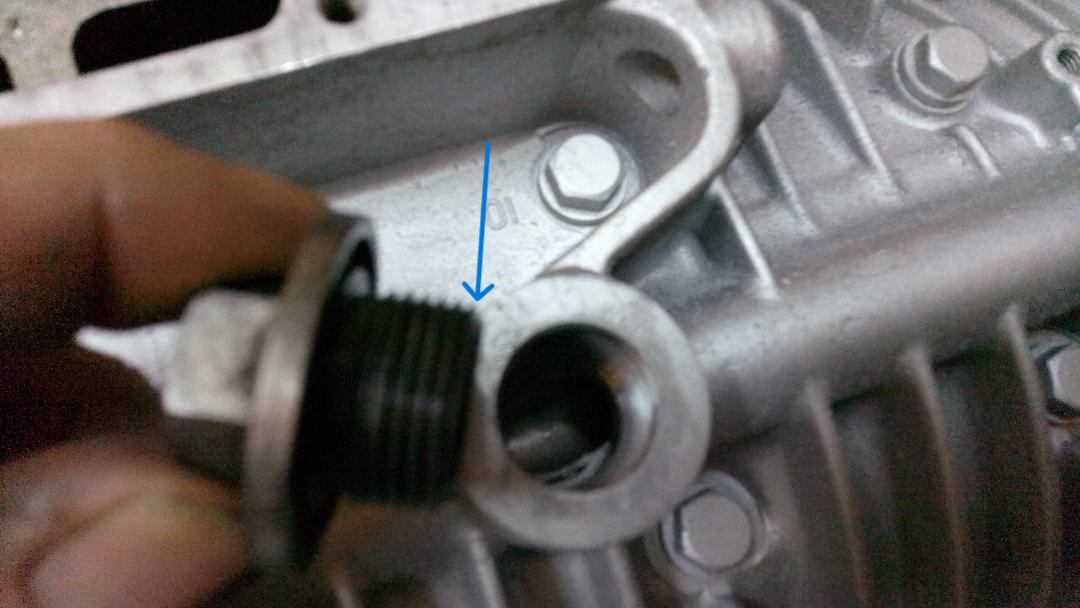 We have the same holes in the oil pan, red color oil pressure, blue color with screw cap.Both holes communicate with each other.