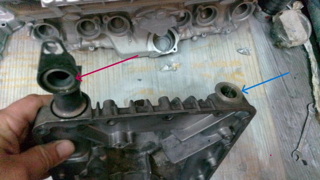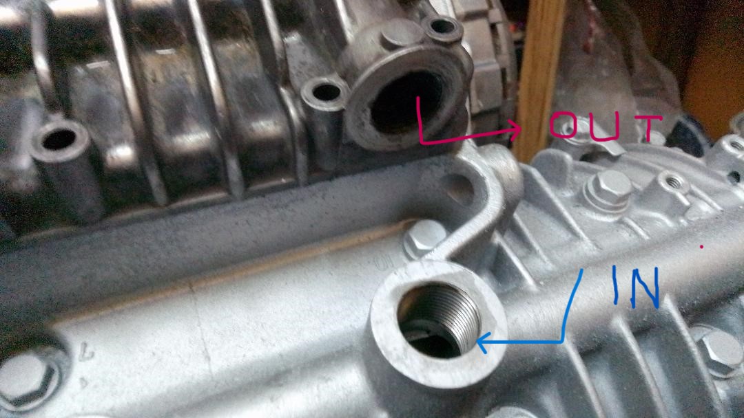 Then use the threaded holes in the crankcase, outlet hole, and in the engine block, inlet hole, to add two hydraulic pressure fittings and a tube to drive an oil circuit to a radiator placed at the front of the motorcycle and bring it back to the entrance to the engine block..