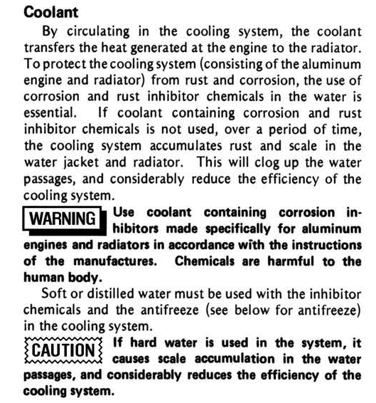 The interior of the cylinder block was found in excellent condition and needed nothing more than a reasonable cleaning especially in the o ring sealing areas primarily due to a build up of some kind of sealing goop that Kawasaki used during the installation of the sleeves into the aluminum block. My concern is based on the scale build up and rusting of the sleeves. Why was the rest of the coolant system in good state of repair and the sleeves showing significant corrosion? I went back to the Factory Service Manual to see if there was a spec on the coolant and found it on page 203 of the manual.