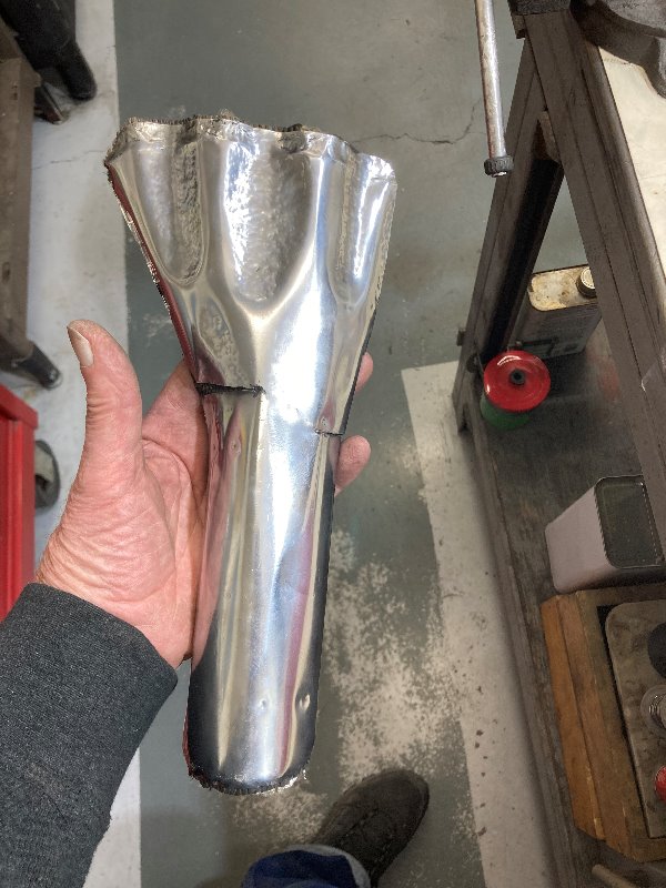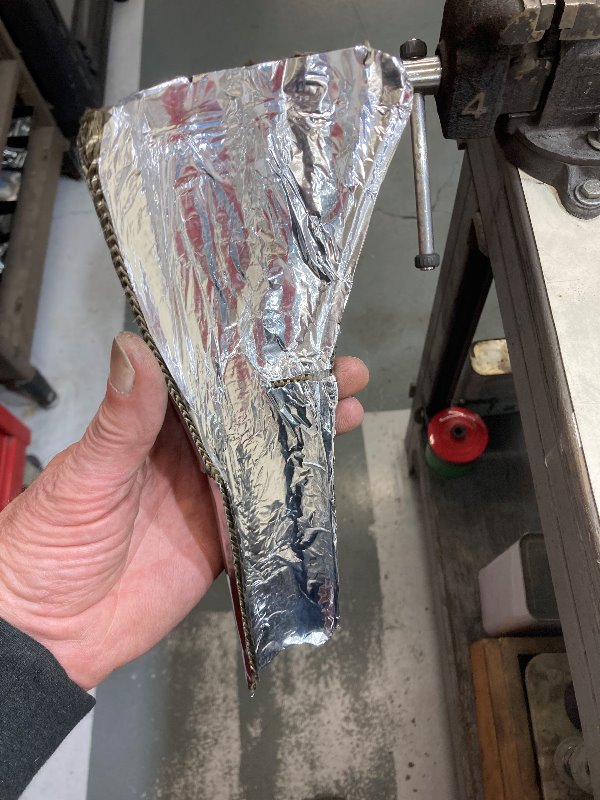 A few years(?) back while reinstalling the oil pan ( oil screen service) I had reason to think about the significant heat transfer from the massive header collector, to the oil pan. I decided to wrap the collector. 34' of header-wrap (one piece) provided a double layer of insulation. It was so effective that I could touch the wrap without burning my hand. While recently dealing with the D.G. bullshit I was considering doing the same with the new collector but thought it would be criminal to hide all that new shiny chrome. My solution for the new exhaust was a S/S shield. It has 2 layers of header-wrap with a layer of aluminum foil and is retained by 2 C/V boot clamps.