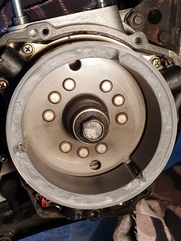 Update on the generator rotor. Advice from auto electrician was, do not try to remove magnets, "you will never get them back on ever!!!". Recommended a tidy up and use a good expoxy resin to the areas necessary. So removed the remaining bits (first photo) and was very tempted to stop there given first couple of photos on page 86 of FSM. However all subsequent photos of the rotor in the manual show bond on the edge. Kawasaki frequently changed/upgraded parts even within a given model year (as I found out when restoring my '73 Z1). Checked part numbers and rotor had same number for A1, A2 & A3, 21007-1015 but this changed to 21007-1048 for A4 & A5. May not mean anything but I decided the bond on the edge was probably there for a reason - oil less likely to be caught on lip of rotor and work between magnets and casing? better oil flow? don't know. Anyway decided to break out the JB Weld and tried to replicate (second photo). Time will tell.