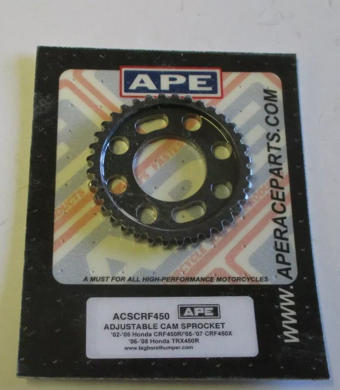 Yea, I got plans for an adjustable camshaft sprocket. Life just keeps getting in the way. If isn't one thing, it's another.the CRF450 camshaft sprocket is the only camshaft sprocket that will work. A minor mod will need to be done to slip it over the cam lobes and a backing plate will need to be machined to attach the sprocket to the camshaft after the original sprocket is machined off.Ape makes an adjustable sprocket for the CRF450 and also Falicon. I have both of these waiting for some time to play machinist.