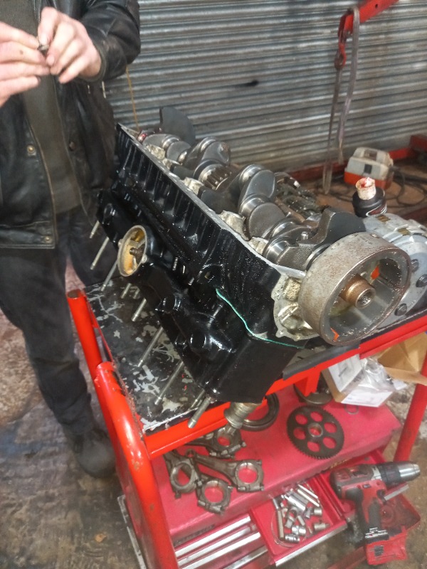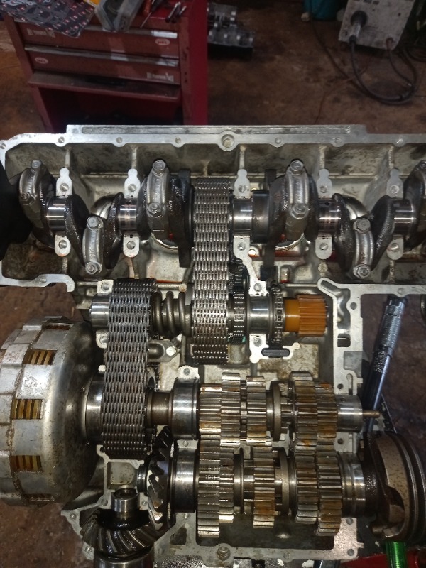 I found it much easier putting the pistons in the bores, securing the barrels to the top case and then lowering the crank over all the rods together. I had 2 friends help but it was easier than getting 18 rings into the barrels the conventional way.