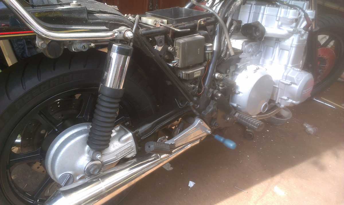 Painted the wheels satin black while I was at it, bit of a meaner look I think. I had to sand what I could down of the peeled chrome on the engine covers to get them flat-ish, best I could do for now without time and money.