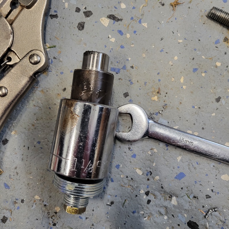Then using a 1-1/8" socket over the end of the pin bore, assembled the 70mm bolt with the 5 fender washers and 10 - 8mm flat washers and installed on the pin. This gave me 5 threads of engagement and left me with 5 threads of space in the pin. So I started to crank on the bolt and at first I thought I was pulling the threads out of the pin but in fact the pin was pulling out. SWEET !!