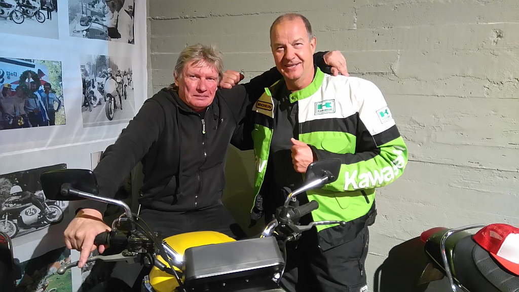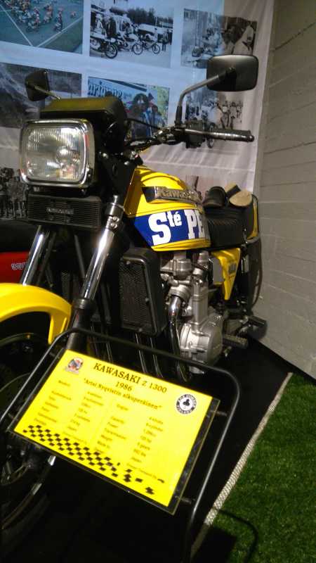 The Kawasaki 50 years party was today and Arto Nyqvist was there in person. The Finnish Motorcycle museum displays his original Pernod colored stunt bike which he used in shows around Europe in the 80s.