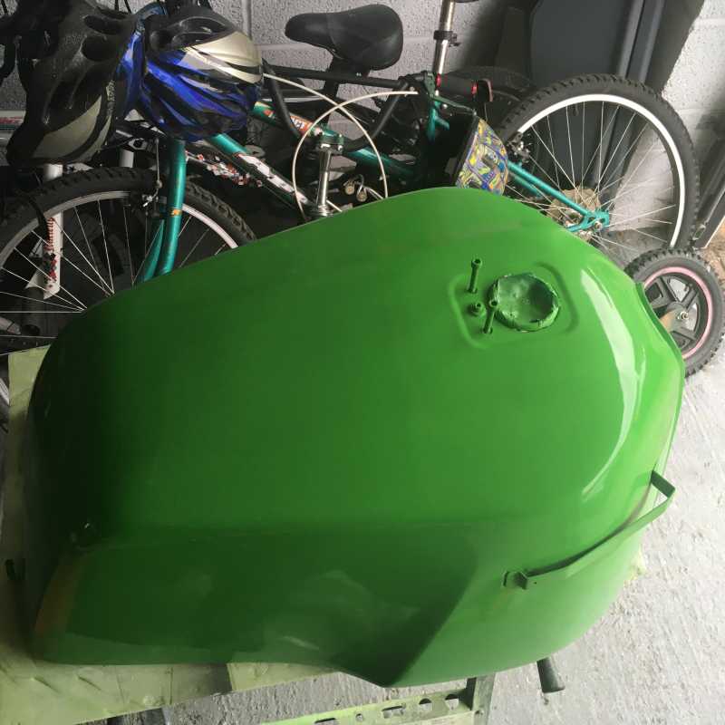 :sick: here is the tank in green. It is not perfect because I am not a sprayer, also I have had some really bad luck with flies landing on it straight after spraying(twice) . They seem to love the colour and come out of nowhere. This tank has just had its first flatting off and already I have found a couple of paint defects. I am going to leave it as is because it is at least good enough sort of. I am also not totally sure that the colour is exactly what I was after- I guess it could be that it needs pin stripes or some other colour breaking design however,I have absolutely no design or artistic flair so Am just asking as many people as possible as to their views and suggestions.